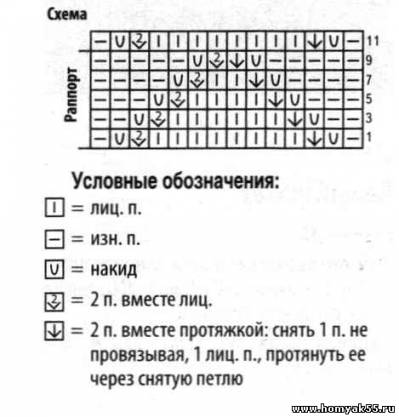 Ажурный узор: вяжите по схеме, на которой приведены только лиц. ряды, в изнаночных рядах петли вяжите по рисунку, накиды провязывайте изн. петлями.
