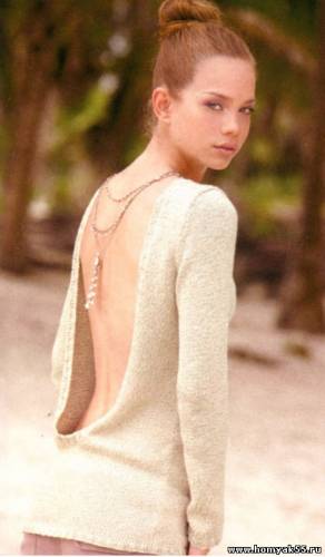Вязать как перед, но для более глубокого выреза на высоте 17,5 см - 52 ряда лиц. глади отложить средние 6 петель и сначала закончить правую сторону. Для закругления выреза отложить с внутреннего края горловины в каждом 2-м ряду 2 х 2 петли. Затем убавить в каждом 2-м ряду 1 петлю, в след. 4-м ряду 1 петлю и в каждом 6-м ряду 20 х 1 петле, выполняя декоративные убавки В. Вторую сторону закончить симметрично.Рукава