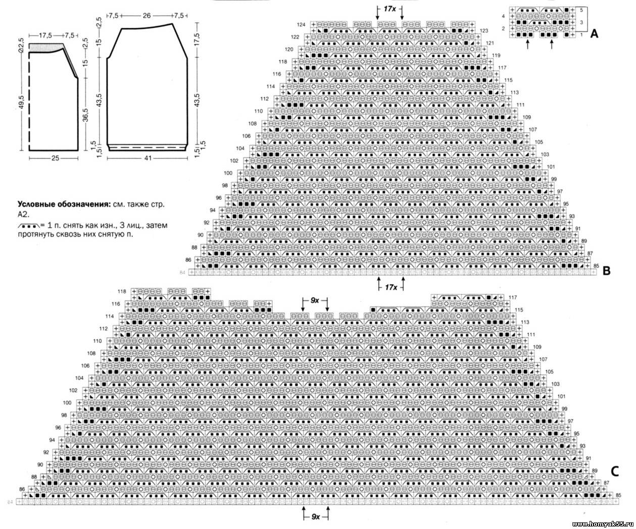 Двумя нитями набрать 99 петель спицами №4,5 и вязать ажурным узором по схеме А, при этом после 2-го ряда перейти на спицы №5. Внимание: на протяжении ажурного узора меняется кол-во петель - после 2-го ряда узора на спице находится 131 петля, после 5-го ряда узора снова 99 петель. Через 36,5 см = 84 ряда от наборного края выполнить регланные скосы по схеме В, при этом начать с петель перед 1-й стрелкой, 17 х выполнить раппорт = 4 петли между стрелками и закончить петлями после 2-й стрелки. На высоте 124 ряда = 17,5 см = 40 рядов реглана закрыть оставшиеся 70 петель.Перед