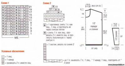 Вязать так же, но с более глубоким вырезом горловины. Для этого через 61 см = 158 рядов (64 см = 166 рядов) от планки закрыть средние 10 (14) петель, в каждом 2-м ряду 3 х 2, 1 х 1 петле и в каждом 4-м ряду 5 х 1 петле.Рукава