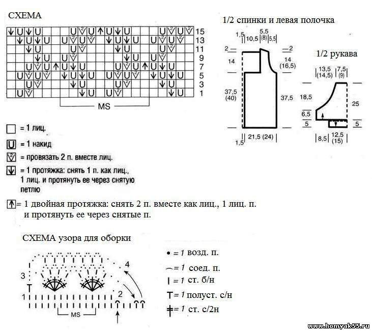 Вязать симметрично и для размера 40/42 ажурный узор начинать с кром., повторять петли раппорта и заканчивать петлями после раппорта и кром. В начале 7-го ряда узора провязать после кром. вместо двойной протяжки 2 петли вместе лиц.