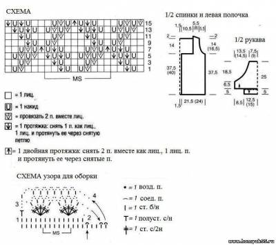 Связать 1 ВП подъема и вязать 1-й ряд рюша по схеме (= изн. ряд), при этом во внутренних 4 углах постоянно вязать 2 петли вместе и во внешних углах - по 3 петли в 1 петлю основания, число петель остается неизменным. Обвязать с правого края выреза горловины правый край застежки 46 СБН + 1 ВП = 219 петель. Остальные петли края застежки остаются свободными. Начиная от стрелки, связать со 2-го по 4-й ряды рюша. Втачать рукава, сильно припосаживая их по окату. Выполнить боковые швы и швы рукавов. Пришить пуговицы.