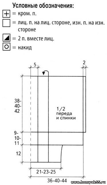 Затем поменяйте спицы на №4,5 и вяжите ажурным узором следующим образом: провяжите 1 петлю перед раппортом, затем повторите 2 петли раппорта 18 (21) 24 раз, последние 6 петель продолжайте вязать резинкой 1 x 1 (планка). Повторяйте 1-4-й ряды узора. На высоте работы 21 (22) 23 см прибавьте в конце лиц. ряда 6 петель для проймы - 49 (55) 61 петель, провязывайте эти петли резинкой 1 x 1. На высоте проймы 38 (40) 42 см, после вывязывания изн. ряда, отложите петли.