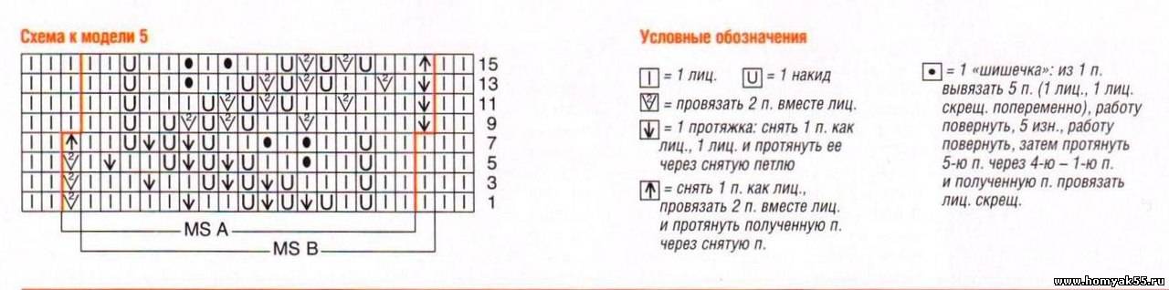 Ажурный узор с «шишечками», спицы № 3: число петель кратно 18 + 5 + 2 кром. Вязать по схеме, на которой приведены только лиц. ряды, в изн. рядах все петли и накиды вязать изн. Начинать с 1 кром. и петель перед раппортом А или В. повторять раппорт А в 1-м - 8-м рядах схемы, раппорт В в 9-м - 16-м рядах схемы, заканчивать петлями после раппорта А или В и 1 кром. Повторять с 1-го по 16-й ряды.