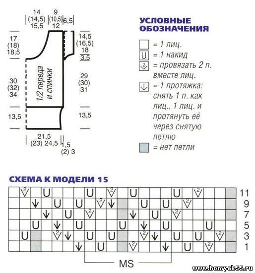 Основной узор: число петель кратно 8 + 4 + 2 кром. Вязать спицами по схеме, на которой приведены только лиц. ряды, в изн. рядах петли и накиды вязать изн. Начинать с 1 кром. и с петель перед раппортом, повторять петли раппорта, заканчивать петлями после раппорта и 1 кром. Внимание! Внутри вертикального раппорта изменяется число петель. Плотность вязания и число петель, указанное в инструкции, всегда относится к первоначальному числу петель. Повторять с 1-го по 12-й ряды.