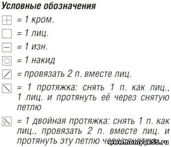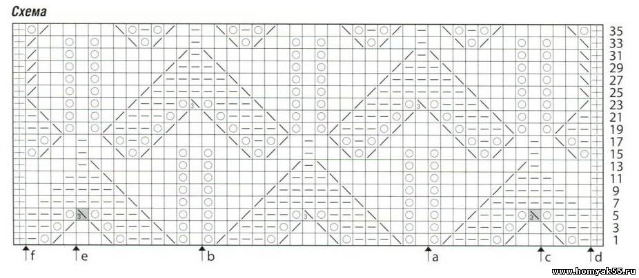 Ажурный узор: вязать по схеме, на которой приведены только лиц. ряды, в изн. рядах петли вязать по рисунку, накиды - изн. Начинать с 1 кром. и петель от стрелки с (d), связать 9 (13) петель до стрелки а, повторять петли между стрелками а и Ь, связать 10 (14) петель до стрелки е (f), 1 кром.