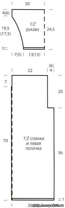 На спицы № 4,5 набрать 57 (65) петель и связать для планки 1 см = 3 ряда платочной вязкой, начиная с изн. ряда. Затем перейти на спицы № 5 и вязать ажурным узором, распределив петли, как на спинке. Через 2 ряда от планки прибавить для скосов рукава с обеих сторон 1 петлю, затем в каждом 4-м ряду 7 (8) х 1 петле и в каждом 2-м ряду 7 (2) х 1 петле = 87 петель, включая прибавляемые петли в узор. Через 19,5 (17,5) см = 46 (42) рядов от планки с обеих сторон сделать отметки. Через 4 (6) см = 10 (14) рядов от отметок все петли закрыть.