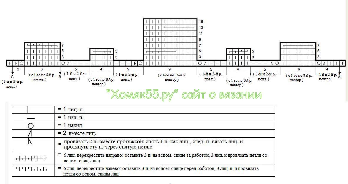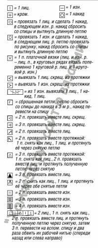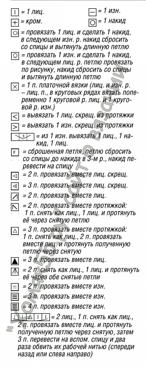 Основной узор, спицы № 4,5: вязать по схеме, на которой приведены только лиц. ряды. В изн. рядах петли вязать по рисунку, накиды - изн. Различные раппорты в высоту повторять, как указано на схеме.