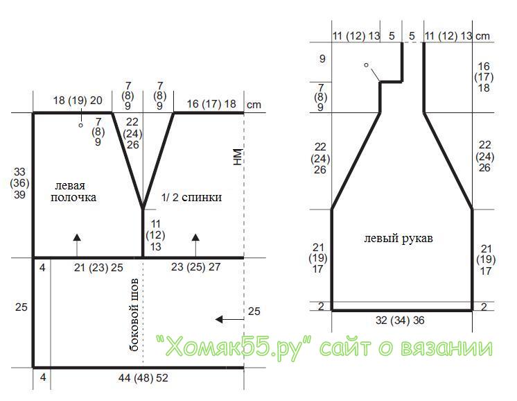 Вязать симметрично, но в 6 петлях косы выполнить с правого края еще 2 отверстия для пуговиц, закрывая средние 2 петли.Левый рукав
