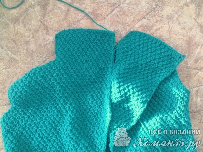 Делаем сразу три убавки в полочке у спинки там, где будет отверстие под рукав. Провязываем далее ряд. Затем провязываем ряд в обратную сторону. В следующем ряду в пройме сделаем две убавки подряд в начале ряда. Провяжем его до конца. Затем провяжем следующий ряд. А в новом в начале также сделаем две убавки в пройме. Довяжем ряд и провяжем еще один. В следующем сделаем одну убавку в начале. И далее мы будем вязать без убавок несколько рядов. Их количество зависит от обхвата руки, плюс три-пять сантиметров. Теперь закроем 20 петель для плеча. А оставшиеся соберем на дополнительную нитку. Это петли для воротника.