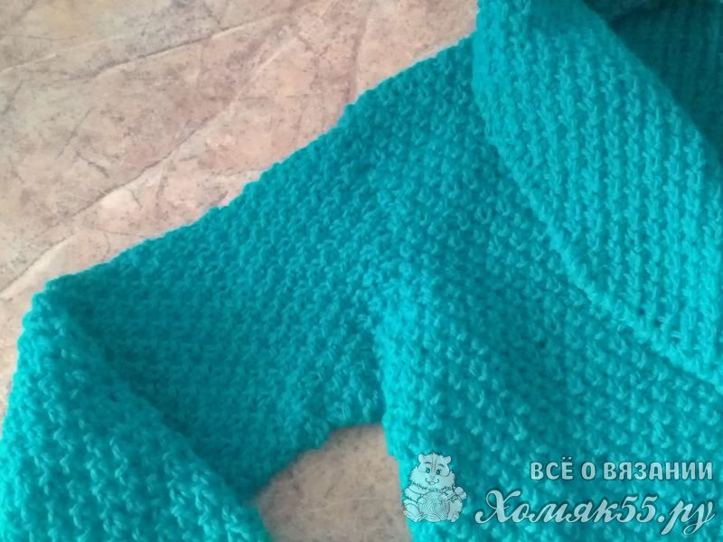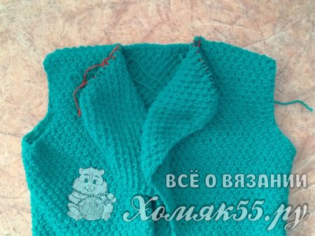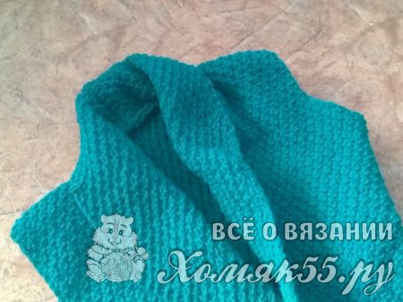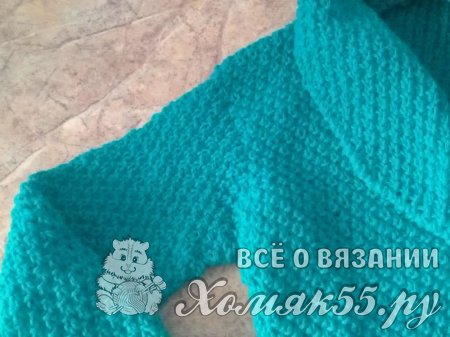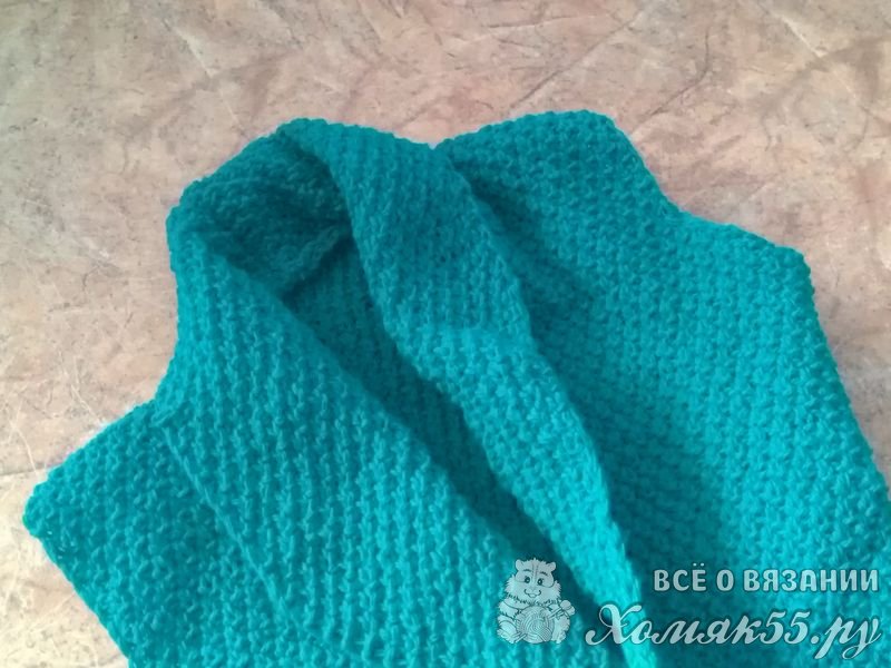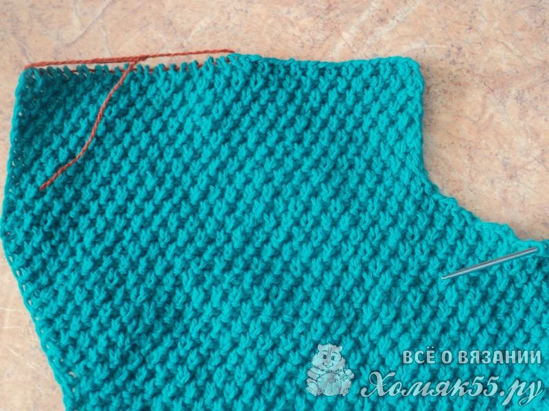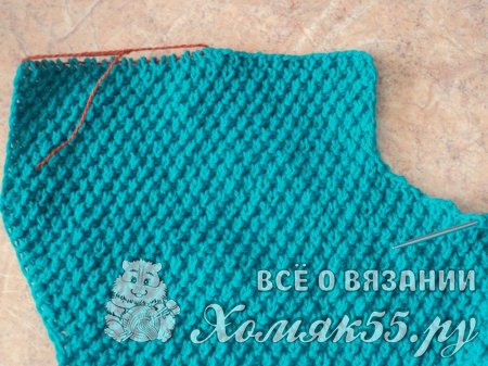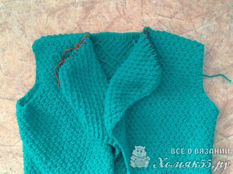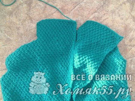 Там, где мы собирали петельки на нитку, переносим с одной стороны на спицу. И вяжем далее половинку воротника. Для этого свободную часть спинки делим пополам и вяжем до отметки. Вяжем просто вверх, прикладывая ворот к спинке для того, чтобы не провязать больше, чем нужно. И затем вяжем вторую сторону ворота аналогично.
