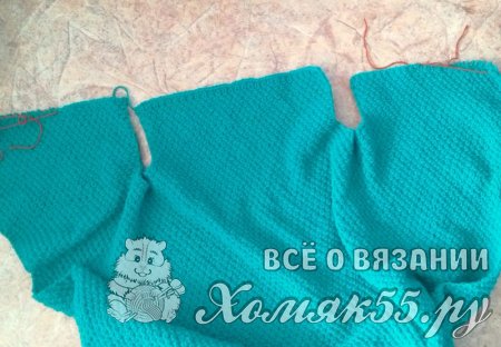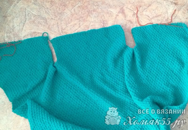 Далее вывязываем пройму и прибавок по бокам больше не делаем. Нам нужно начальное количество петель (156) поделить на две части. Одна часть будет спинка. И вторую часть делим на два и получаем количество петель для каждой полочки. Плюс те прибавки, которые мы сделали для воротника. Например, мы сделали по 10 прибавок с каждой стороны. 156 делим на 2 и получаем 78 петель. Их также делим на два и получаем 39 петелек. Так полочка будет состоять из 39 петель плюс 10 на воротник (прибавки).