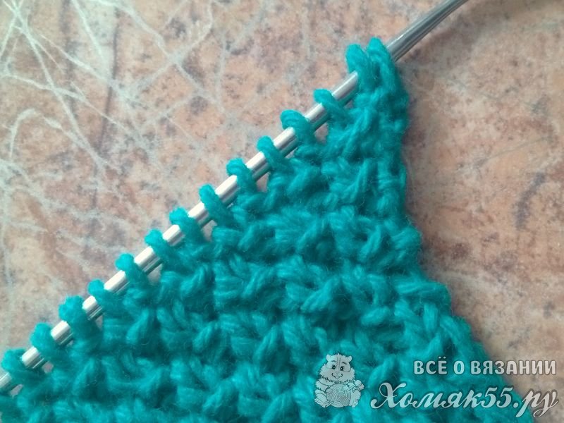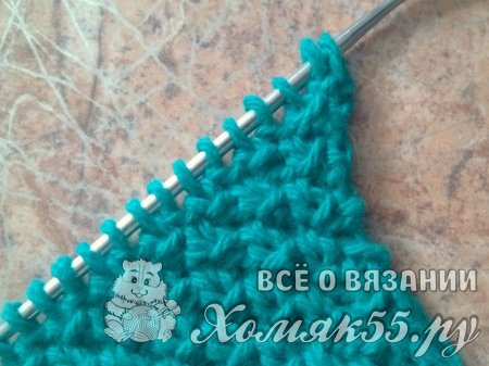Теперь мы будем вязать все то же самое, но делая прибавки по бокам. В первую петельку нам нужно провязать две новые петли. Но их нужно провязывать так, чтобы они не портили рисунок, а повторяли его. Провязываем ряд до конца. Начинаем новый и в нем также из первой петли вяжем две. И так далее до проймы. У нас по бокам будет такое постепенное расширение.