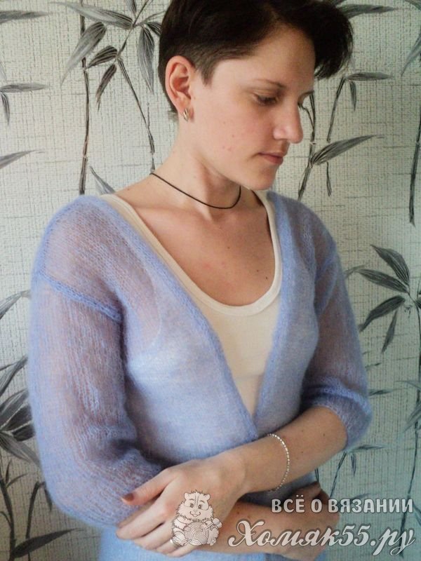 Скоро лето, но даже в это время года бывают прохладные дни. И поэтому свяжем уютный и красивый кардиган из мохера. Он очень легкий. Весит всего около 60 граммов. Вязать такой кардиган будем из кид мохера в одну нитку. На кардиган уходит 2,5-3 мотка пряжи.