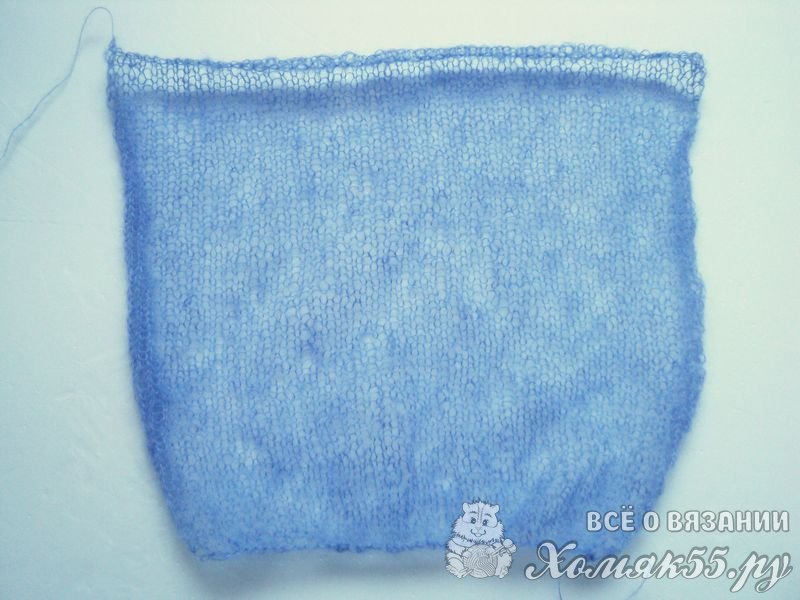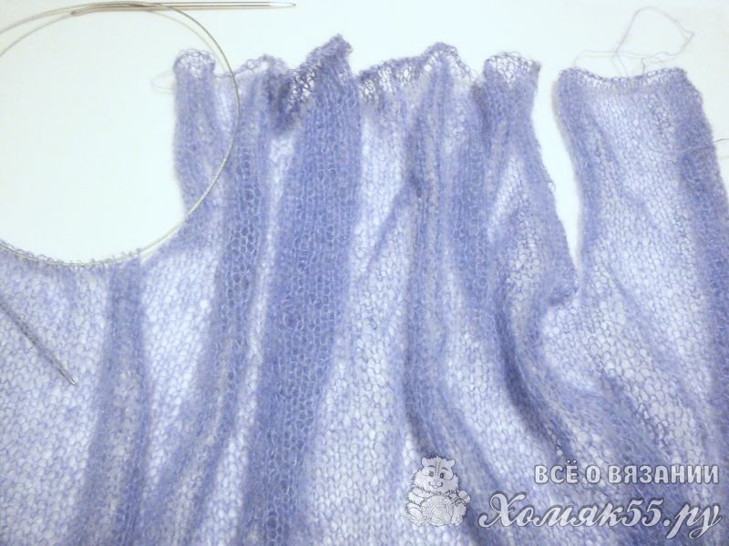 Нам нужно провязать 34 ряда лицевой глади. То есть вяжем только полочку, все остальное не вяжем, а просто оставляем на спицах. После 34 ряда закрываем петли полочки.