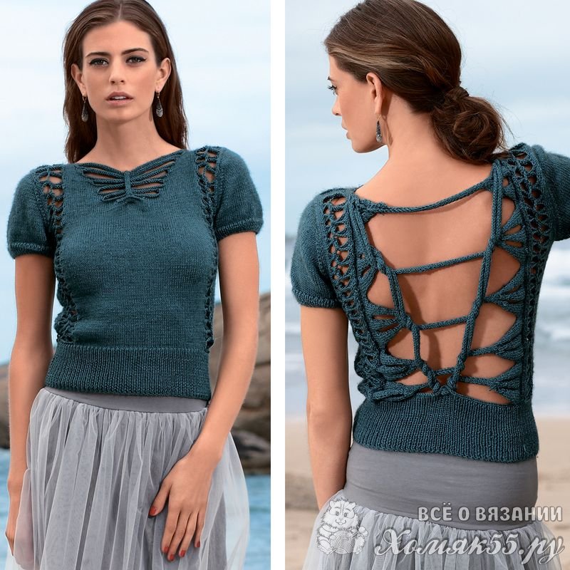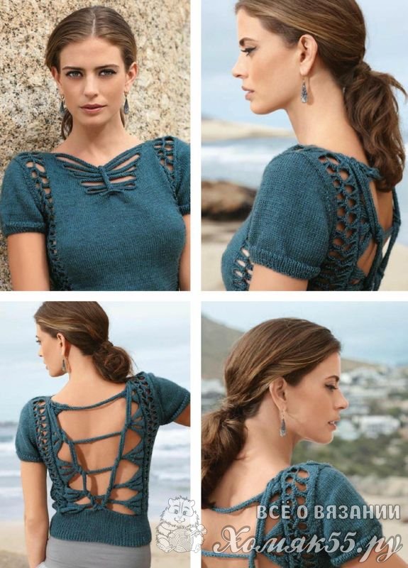 Пуловеры с имитацией шнуровки выглядят сексуально, и не только на первый взгляд! Спереди наша модель кажется скорее классической, с прелестными небольшими шнуровками, зато на спинке демонстрирует сногсшибательно соблазнительное декольте.