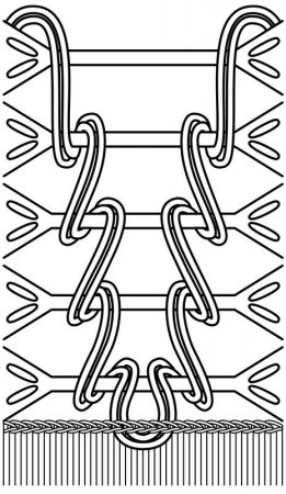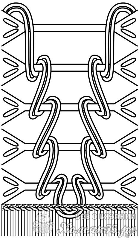 Выполнить переплетение полос с плетеным узором. Для этого на средней части спинки связать 2 ленты на 5 петлях лиц. гладью длиной каждая около 90 см. Ленты пришить к верхнему правому краю к 1-му зубцу на спинке, вместе провести вниз и обвить вокруг каждой перемычки, см. схему, под закрепленным краем планки изнутри наружу и рядом снаружи вовнутрь, затем снова вверх, таким же образом обвить все перемычки.