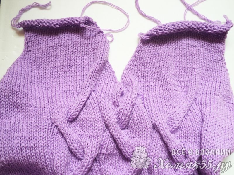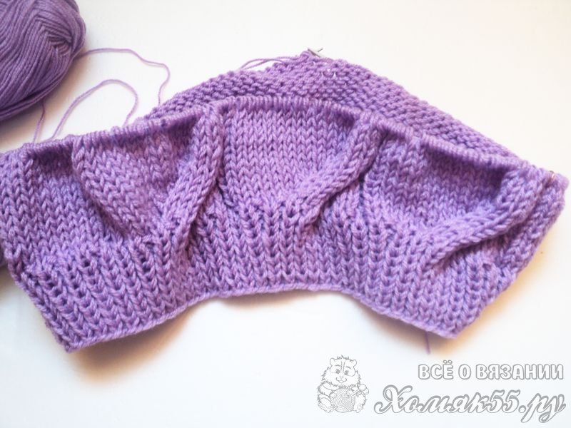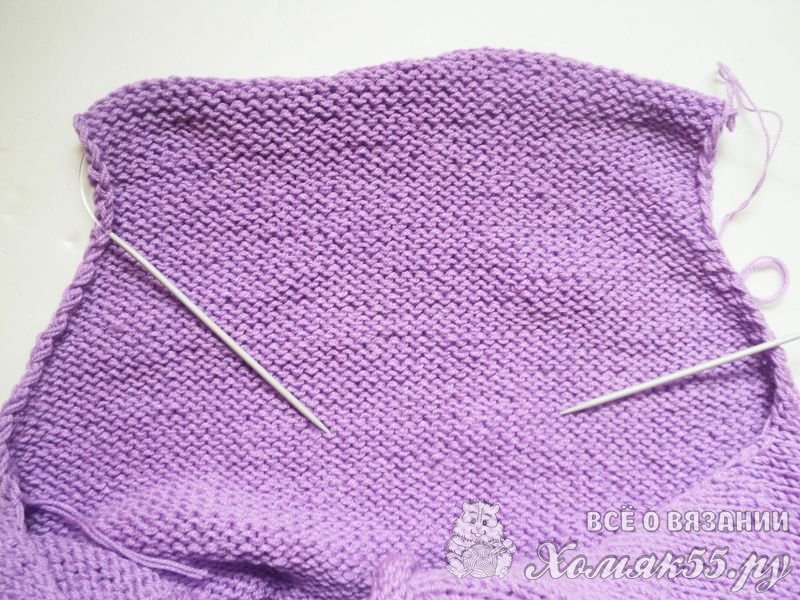 По спинке мы далее провязываем убавки с двух сторон в 1, 3, 5, 7, 9, 11, 13, 15 и 17 ряду. Далее просто вяжем лицевой гладью еще 17 рядов без убавок.