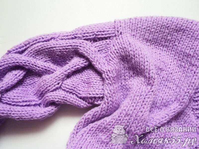 Набираем затем петли из проймы. Всего нужно набрать 60 петель. По 20 на косу. И здесь мы просто повторяем узор косы, как вязали на самом свитере. Заканчиваем вязать рукав резинкой 1 на 1.
