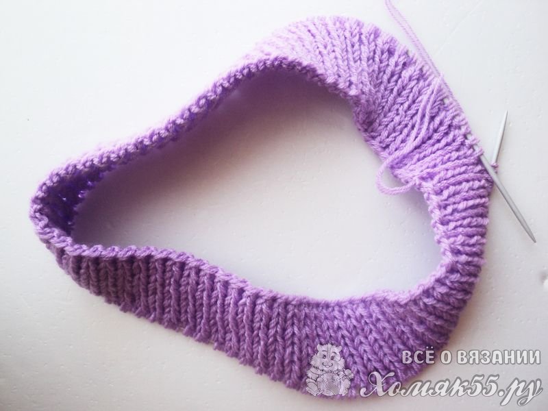 Вяжем резинку 1 на 1. Не довязываем до центральной петли (уголок) 1 петельку. И провязываем лицевой петлей сразу 3 петли. Продолжаем вязать ряд резинкой 1 на 1. В следующем ряду и четырех других рядах будем не довязывать до центральной петельки 1 петлю. Провязываем тут так. Меняем местами нашу недовязанную петельку с центральной. И провязываем 3 петли лицевой за заднюю стенку. Вяжем далее резинкой 1 на 1. И так всего нужно провязать 4-5 рядов.