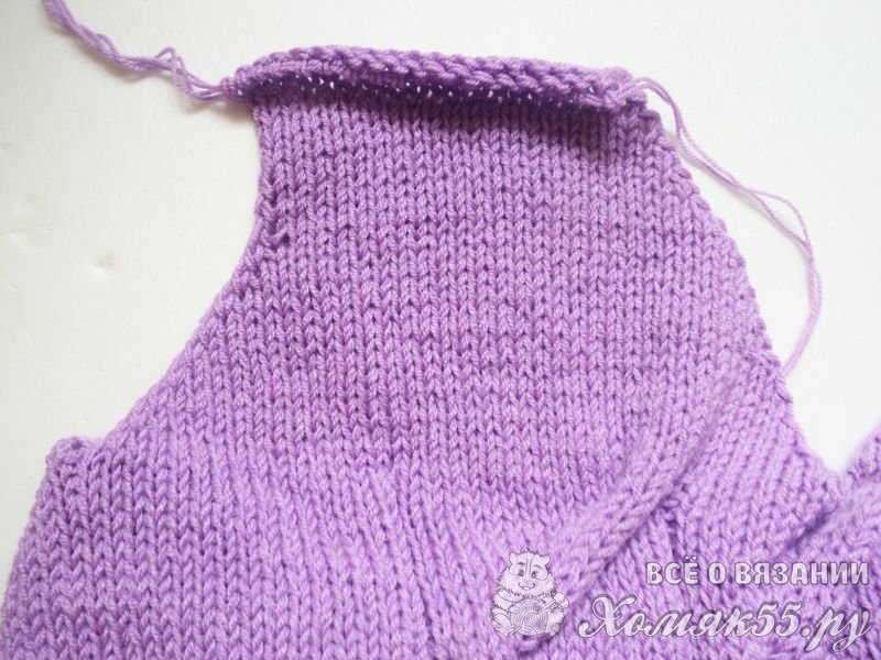 Сшиваем плечи. Набираем теперь петли из выреза под горло. В уголочке в серединке у нас должна идти лицевая петелька. Поэтому отсчитываем от нее петли к началу ряда, чтобы понять, с какой петельки начать вязание (лицевой или изнаночной).