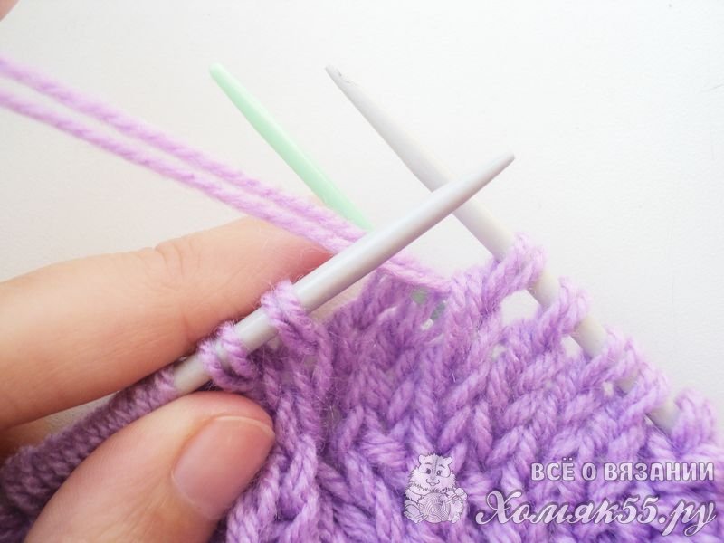 Далее вяжем 5 лицевых петель (л/п). Возвращаем 2 петельки с дополнительной спицы обратно на левую спицу. И провязываем их л/п. Вяжем 5 л/п и 1 и/п. Все это мы повторим еще 2 раза.