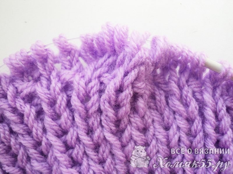 1 ряд узора: 1 изнаночная петля (и/п). 6 лицевых. Следующие 2 петли снимаем на дополнительную спицу и оставляем их за работой.