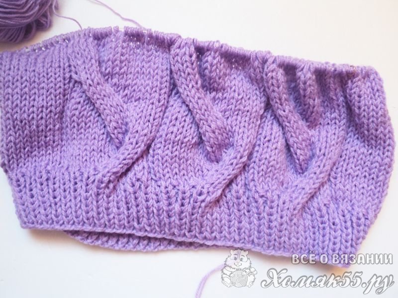 2 ряд узора:вяжем 1 и/п и 4 л/п. 2 петли оставляем за работой, сняв их на доп. спицу. Провязываем 5 л/п. Возвращаем обратно 2 петли с доп. спицы и провязываем их лицевыми. Вяжем 7 л/п и 1 и/п. Повторим еще 2 раза.