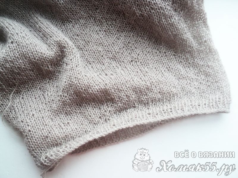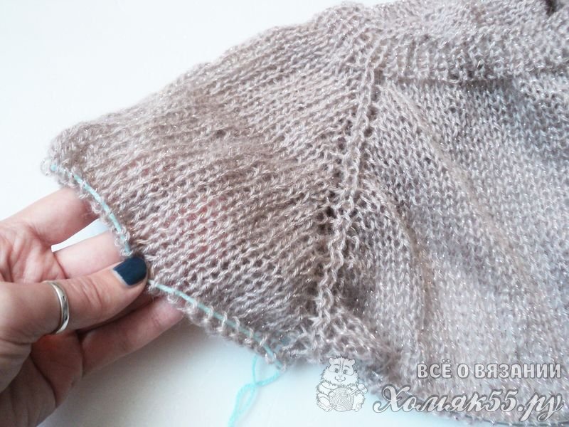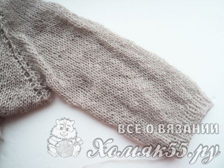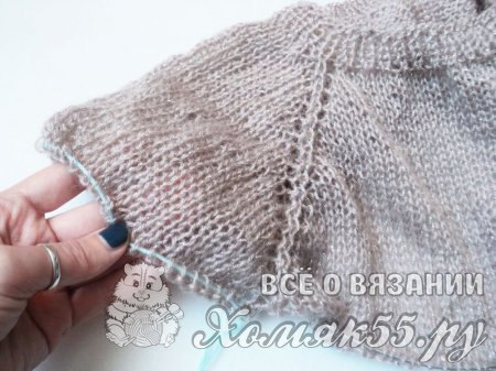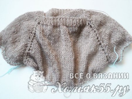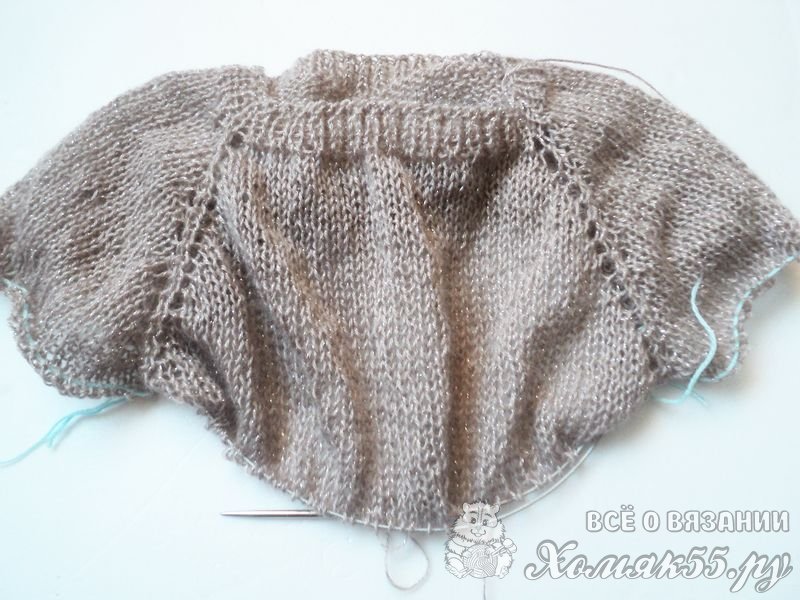 И осталось провязать 10 петель второго рукава. И прибавка. Другой ряд будем вязать лицевой гладью и без прибавок в виде накидов. Получатся в местах накидов дырочки, так и надо. В следующем ряду снова будем выполнять прибавки у петель реглана. И далее вновь ряд лицевых петель без прибавок. И так далее. Вот так будет выглядеть реглан.