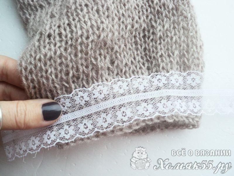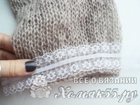 Все, джемперок готов. И теперь возьмем кружево. Отмерим по низу джемпера обхват и прибавим к этому числу половину сантиметра. Отрезаем кружево и вручную пришиваем его к резинке.