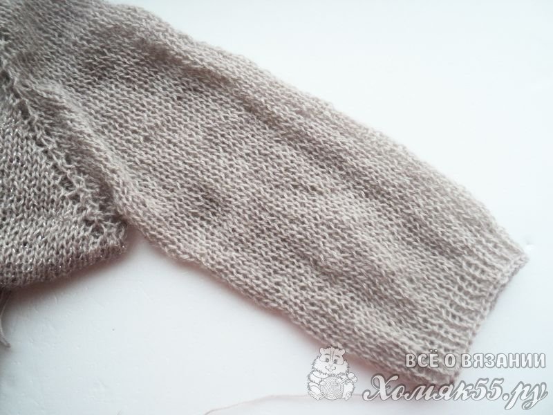 Возвращаемся к рукавам. Вяжем первый рукав также по кругу и лицевой гладью. Довяжем чуть ниже локтя. И закончим тоже резинкой в пару сантиметров.
