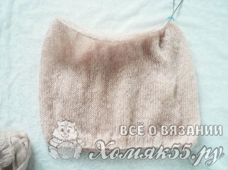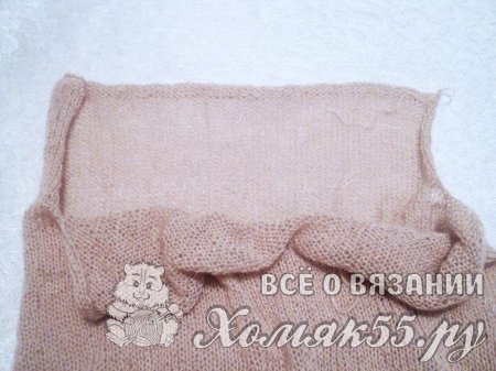 И теперь делим вязание на 2. Получаем 76 петель. По 38 петелек пойдет на полочки и оставшиеся 76 петель на спинку. Вяжем спинку лицевой гладью и разворотными рядами. Провязываем 33 ряда. И затем закрываем все 76 петель спинки.
