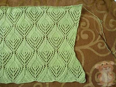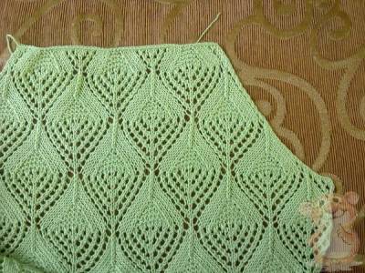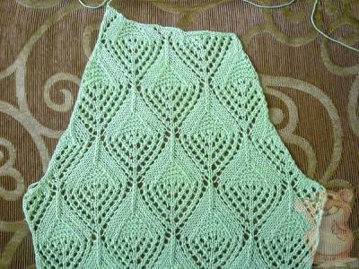 2 ряда прямо, прибавить 7 раз в каждом 4-ом лицевом ряду, 9 лиц. рядов прямо (для переда 11 лиц. рядов прямо) = связано до проймы, до начала реглана.
