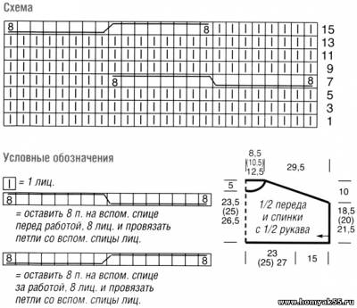 Коса (из 24 петель): вязать по схеме, на которой приведены только лиц. ряды, в изн. рядах петли вязать изн. Повторять с 1-го по 16-й ряды.