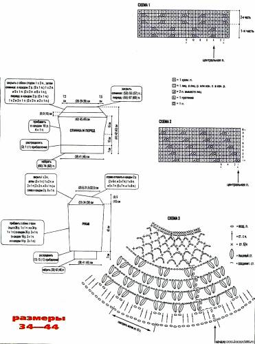 На спицы №3 набрать (66) 74 (82) петель и вязать 7 см (21 ряд) резинкой 2 х 2: начинать и заканчивать 2-мя лиц. петлями, затем провязать 1 изн. ряд изн. петлями, распределив (3) 1 (1) прибавление = (69) 75 (83) петель.$CUT$ Далее вязать на спицах №3,5 фантазийным узором 1 (первая часть схемы 1): начинать с 1 кром. петли и с (7-й петли) 4-й петли (1 лиц. п. и 1-й п.). 4-я петля на схеме расположена в центре работы.Через 10 см от резинки прибавить с обеих сторон в каждом 10 ряду 4 х 1 петле = (77) 83 (91) петель. Одновременно через 14 см после резинки вязать 2-ю часть узора по схеме 1, затем через 23 см от резинки вязать по схеме 2, расположив 1-ю петлю схемы в центре работы. Через 26 см после резинки для выполнения реглана закрыть с обеих сторон 1 х 3 петли, затем в каждом 2 ряду (9 х 1 петле) 1 х 2 петли и 9 х 1 петлю (3 х 2 петли и 8 х 1 петлю). Через (34) 35 (36) см после резинки закрыть оставшиеся (53) 55 (57) петель.