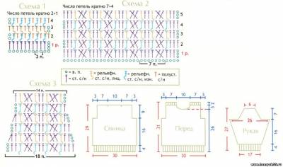 Крючком №2 набрать цепочку из 67 ВП и связать 4 см резинкой по схеме 1.$CUT$ Продолжить вязание крючком №2,5 узором по схеме 2. На высоте 20 см для пройм оставить непровязанными с обеих сторон по 6 петель = 55 петель и вязать прямо. На общей высоте 29 см закончить вязание.