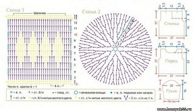 Нитью серого цвета набрать цепочку из 37 ВП, связать 1 ряд СБН, 3 ряда ССН, 14 рядов по схеме 1 и продолжить ССН нитью серого цвета. Одновременно прибавить с обеих сторон в каждом 4-м ряду 4 раза по 1 петле = 45 петель. На высоте 16 см убавить для оката рукава с обеих сторон в каждом ряду 3 петли, 6 раз по 2 петли = 15 петель и закончить вязание. Общая высота около 21 см.