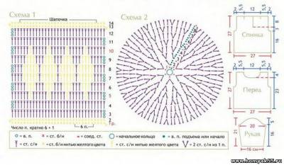 Нитью серого цвета набрать цепочку из 61 ВП, связать 1 ряд СБН, 3 ряда ССН, 14 рядов по схеме 1 и продолжить ССН нитью серого цвета. На высоте 16 см убавить для пройм с обеих сторон в каждом ряду 3 петли и 2 раза по 1 петле = 51 петля. Через 3 см от начала пройм оставить непровязанной для разреза среднюю петлю и вязать обе стороны отдельно. На общей высоте 27 см, получив по 12 петель для каждого плеча и по 13 петель для выреза горловины, закончить вязание.