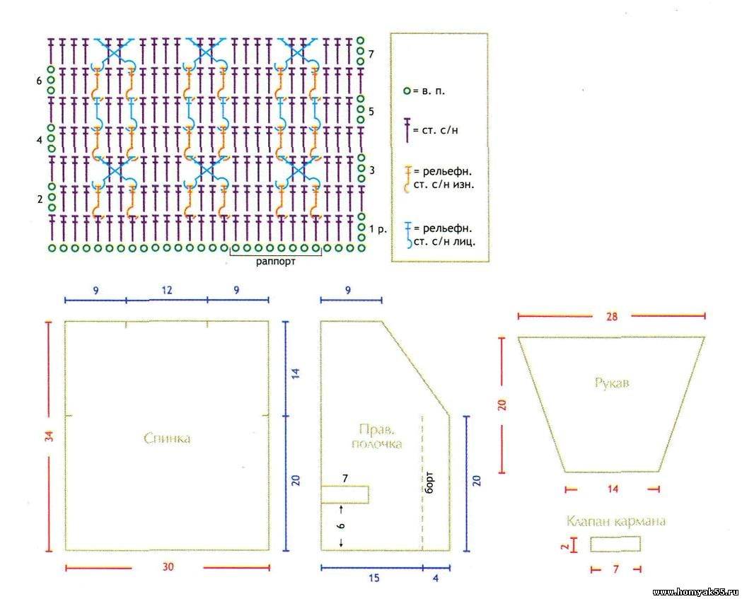 Детали увлажнить и дать им высохнуть. Выполнить плечевые и боковые швы, вшить рукава и пришить клапаны карманов. Все изделие обвязать 2 рядами СБН. Пришить пуговицы, в качестве петель использовать отверстия в узоре.