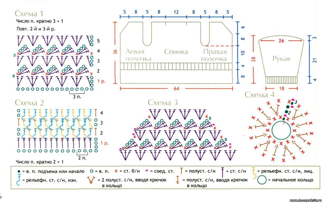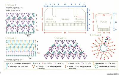 Вязать одной деталью.$CUT$ Набрать цепочку из 79 ВП и вязать узором по схеме 1. На высоте 8 см связать 4 см резинкой по схеме 2 и продолжить узором по схеме 1. На высоте 22 см от начала вязания нитью контрастного цвета наметить петли след. образом: по 17 петель каждой полочки, по 4 петли каждой проймы и 37 петель спинки. Продолжить вязание 17 петель правой полочки, убавив для проймы во 2-м ряду 1 петлю = 16 петель. На высоте 8 см от начала проймы убавить для скоса горловины 6 петель по схеме 3 = 10 петель плеча. На общей высоте 36 см закончить вязание. Левую полочку вяз. симметрично правой.Возобновить вязание 37 петель спинки, убавив для пройм с обеих сторон в след. ряду по 1 петле = 35 петель. На общей высоте 36 см, получив по 10 петель для каждого плеча и 15 петель для выреза горловины, закончить вязание.