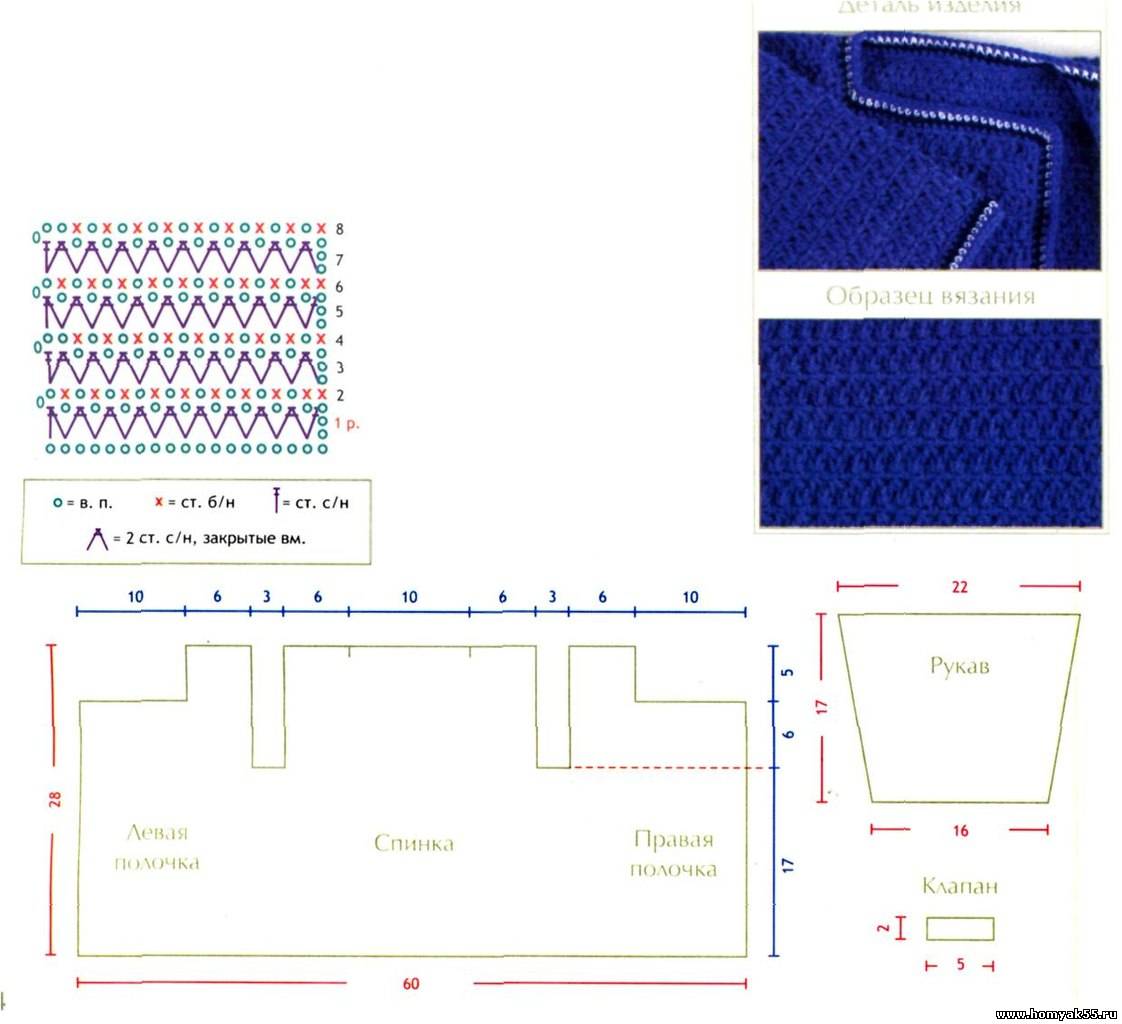 Вязать одной деталью. Нитью фиолетового цвета набрать цепочку из 162 ВП и вязать узором по схеме. На высоте 17 см разделить работу след. образом: 44 петли левой полочки, закрыть 8 петель проймы, 58 петель спинки, закрыть 8 петель проймы, 44 петли правой полочки. Вязать правую полочку 6 см прямо, закрыть для выреза горловины 28 петель и на общей высоте 28 см закончить вязание.