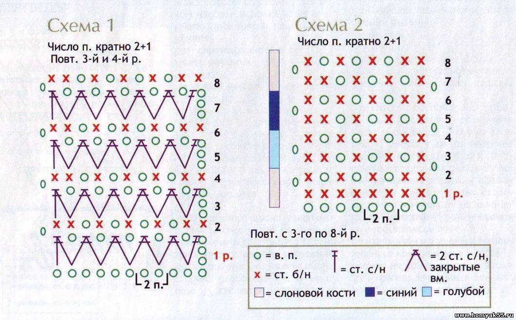Нитью цвета слоновой кости набрать цепочку из 11 ВП и вязать узором по схеме 2. На высоте 6 см, учитывая, что последним должен быть связан ряд нитью цвета слоновой кости, обрезать нить.