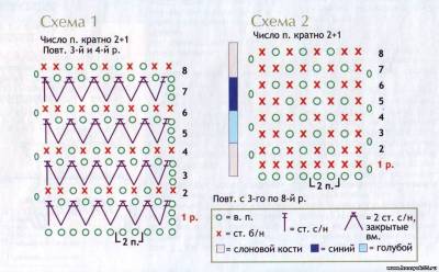 Нитью цвета слоновой кости набрать цепочку из 23 ВП и вязать узором по схеме 1. На высоте 16 см убавляем для проймы в каждом 2-м ряду 4 раза по 1 петле = 19 петель. На высоте 23 см от начала вязания закрыть для выреза горловины в каждом ряду 3 петли, 2 петли и 2 раза по 1 петле = 12 петель. На общей высоте 27 см закончить вязание.