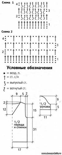 Свяжите цепочку из 85 ВП, провяжите 1 ряд ССН и вяжите крючком 2 ряда резинки белым, 2 ряда - бирюзовым, 2 ряда - белым цветом. Затем вяжите узором «сетка». На высоте 31 см от начала вязания убавьте для пройм в каждом 2-м ряду с обеих сторон 5 раз х 2 петли. На высоте 44 см оставьте для выреза горловины средние 28 петель непровязанными и закончите вязание раздельно.$CUT$ Для закругления выреза горловины в каждом 2-м ряду убавьте 3 раза х 2 петли. На высоте 46 см закройте петли плеча.