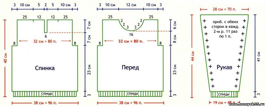 Выполнить швы и вшить рукава в проймы. По краю выреза горловины пряжей белого цвета на спицы №3 поднять 90 петель, связать 2 см резинкой и закрыть все петли по рисунку. По краям разреза спинки на спицы поднять по 26 петель, связать 1,5 см резинкой и закрыть все петли по рисунку. На правой стороне выполнить 2 отверстия для пуговиц (обметать 1 петлю): первое - около 0,5 см от верхнего края и второе - около 3 см от нижнего края разреза. Пришить пуговицы.