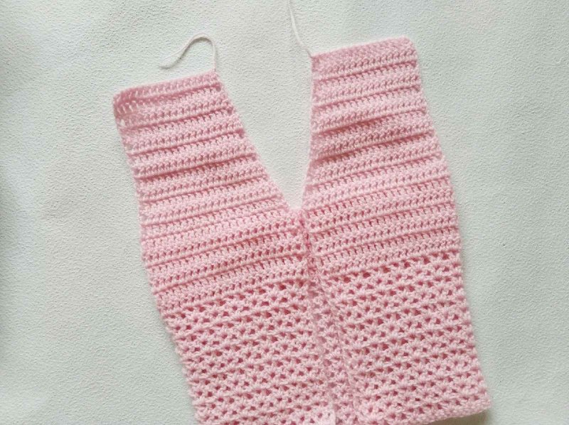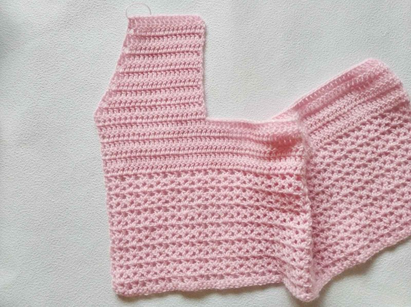 Вяжем в обратную сторону ряд без убавки. Затем снова ряд с убавкой у груди и так далее, пока не свяжем нужную высоту полочки до верха плеча.