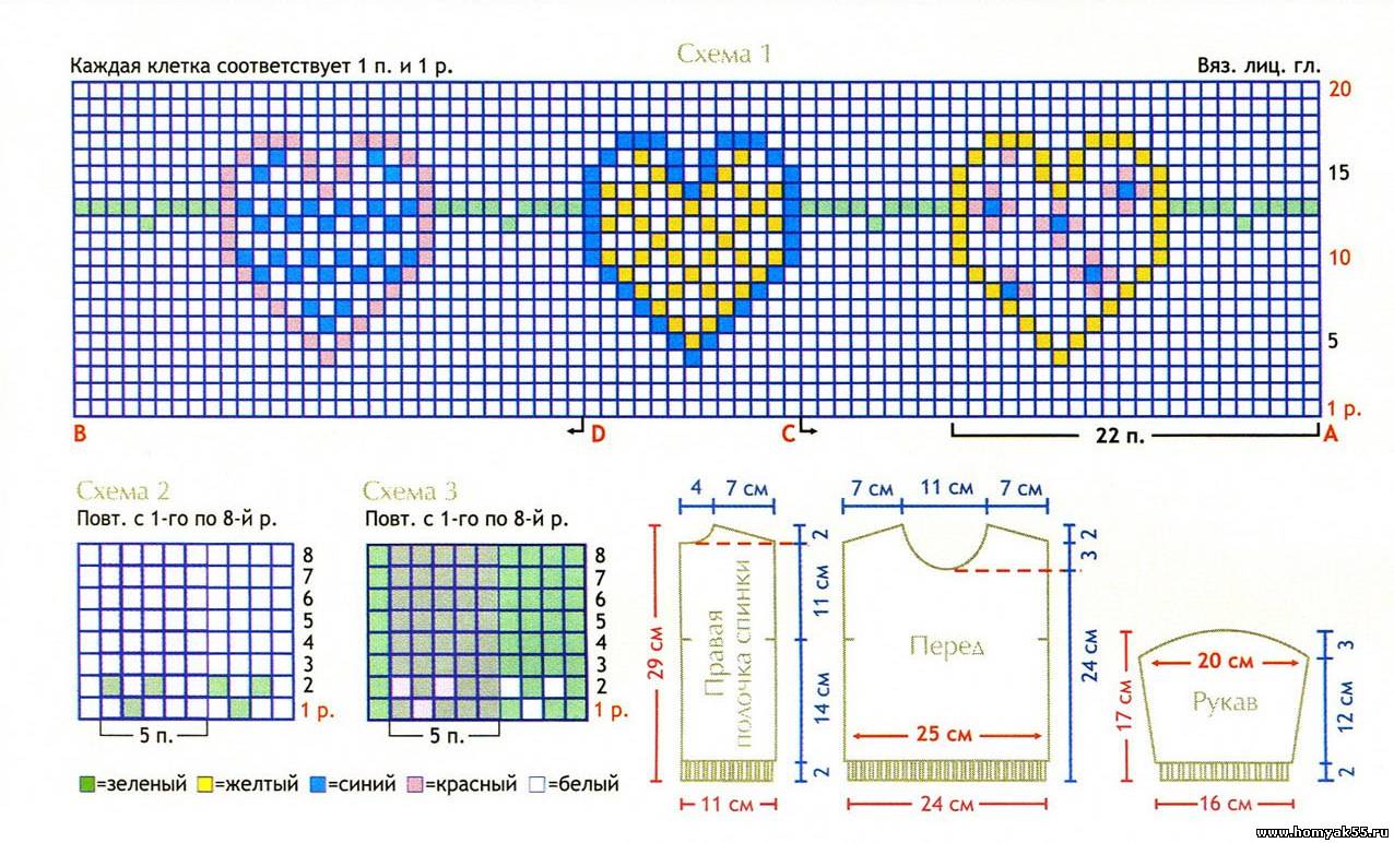 Нитью зеленого цвета на спицы №3 набором двойного вязания набрать 33 петли и продолжить нитью белого цвета резинкой 3 х 3. На высоте 2 см. заменить спицы на №3,5, связать нитью зеленого цвета 4 ряда лицевой гладью, затем 20 рядов жаккардового узора по схеме 1 от А до С и продолжить жаккардовым узором по схеме 2 до конца работы. Одновременно, на высоте 16 см. от начала вязания, наметить нитью контрастного цвета со стороны бокового шва пройму и вязать прямо. Через 11 см. от начала проймы закрыть для выреза горловины 6 петель и в каждом 2-м ряду 2 раза по 3 петли. Одновременно закрыть для скоса плеча в каждом 2-м ряду 3 раза по 7 петель. Общая высота около 29 см.