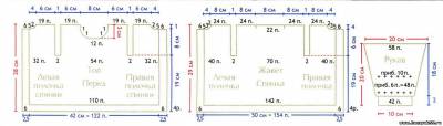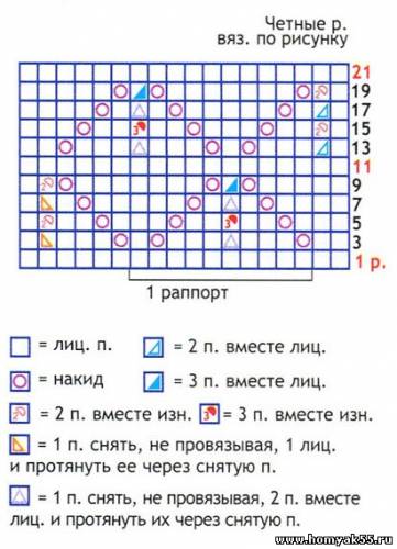 Фантазийный узор: шёлковой нитью - 1-й ряд: *2 петли вместе лиц., 1 лиц., 1 накид*, 1 лиц., повторять от * до конца ряда. 2-й ряд: изн. Акриловой пряжей: 3-й, 7-й и 11-й ряды: *1 изн., снять 1 лиц., не провязывая,нить перед работой*, повторять от * до конца ряда. 4-й и все чётные ряды: все петли изн. 5-й, 9-й и 13-й ряды: 1 лиц., *1 изн. петля, снять 1 лиц., не провязывая, нить перед работой*, 1 лиц., повторять от * до конца ряда. Повторять с 1-го по 14-й ряды ещё 1 раз, затем связать 1-й и 2-й ряды = 30 рядов.
