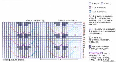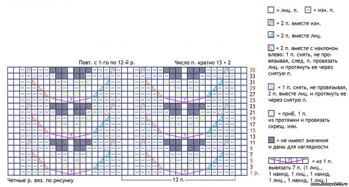 Резинка 1 х 1: вяжите попеременно 1 лиц., 1 изн. Изнаночный ряд вязать по рисунку.