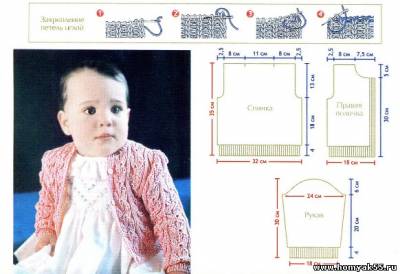 Набрать 45 петель, связать 4 ряда двойной резинкой и продолжить резинкой 1 х 1. На высоте 4 см. распределить петли следующим образом: 6 петель резинкой 1 х 1 в качестве планки застёжки и оставшиеся 39 петель вязать узором по схеме, начиная 5 изн., вместо 2 лиц. На высоте 22 см. от начала вязания закрыть для пройм со стороны бокового шва 3 петли, в каждом 2-м ряду 2 петли и 1 петлю = 39 петель. На высоте 30 см. от начала вязания закрыть для выреза горловины с противоположной стороны 6 петель и в каждом 2-м ряду 3 раза по 3 петли и 2 раза по 2 петли. На общей высоте 35 см. закрыть 20 петель для плеча и закончить вязание.